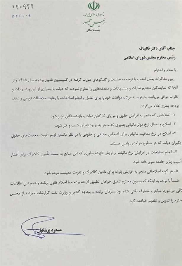 در شرایطی که قرار بود کلیات لایحه در صحن علنی مجلس بررسی و به رأی نمایندگان گذاشته شود، نامهای از سوی رئیس دولت به مجلس ارائه شد. در این نامه پنجبندی، دولت با انجام برخی اصلاحات مدنظر مجلس از جمله افزایش حقوقها، افزایش سقف معافیتهای مالیاتی، کاهش برخی مالیاتها و تعیین تکلیف کالابرگ اعلام موافقت کرده بود. همچنین در بخش پایانی این نامه، به ارائه گزارش تطابق لایحه بودجه با برنامه هفتم توسعه و وضعیت منابع و مصارف (درآمدهای) نفتی کشور اشاره شده بود.