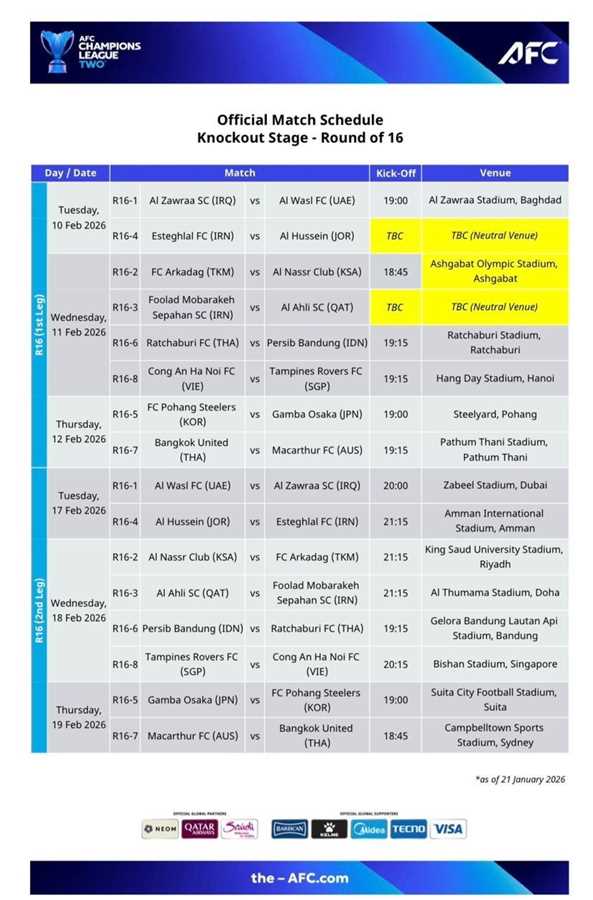 به گزارش خبرگزاری شرق نو، کنفدراسیون فوتبال آسیا (AFC) برنامه دیدارهای مرحله یکهشتم نهایی لیگ قهرمانان آسیا2 را ویرایش کرد. AFC که پیشتر ورزشگاه شهدای شهر قدس را برای دیدار رفت استقلال ـ الحسین اردن، استادیوم نقشجهان اصفهان را بهعنوان میزبان بازی رفت سپاهان ـ الاهلی قطر و ورزشگاه یادگار امام تبریز را برای انجام دیدار تراکتور ـ السد قطر معرفی کرده بود، نام این دو ورزشگاه و ساعت برگزاری بازیها را حذف کرد و عبارت «تعیین خواهد شد (زمین بیطرف)» را مقابل نام این سه مسابقه نوشت.