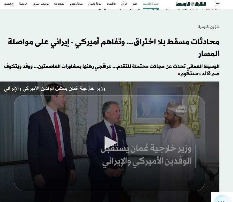 روزنامه الشرق الاوسط با انتشار تصویری از این دیدار، گزارش داد که میانجی عمانی از حوزههای بالقوه پیشرفت سخن گفته است و عباس عراقچی (وزیر امور خارجه ایران) این موضوع را به رایزنیهای بین دو پایتخت مرتبط کرده است. این روزنامه همچنین اشاره کرد که هیئت آمریکایی شامل فرمانده سنتکام بوده است و هرچند ادعا کرد مذاکرات پیشرفت چشمگیری نداشته است، اما از تفاهم دو طرف برای ادامه روند گفتوگوها خبر داد.