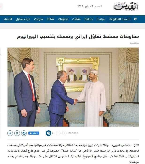روزنامه القدس العربی (نزدیک به دیدگاههای قطر) نیز با تیتر «مذاکرات مسقط؛ خوشبینی و اصرار ایران بر غنیسازی اورانیوم» به این موضوع پرداخت و بر پایبندی تهران به حقوق هستهای خود تأکید کرد.